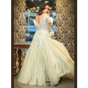Lime green gown with delicate silver dori and stonework on the yoke and voluminous net and satin skirt