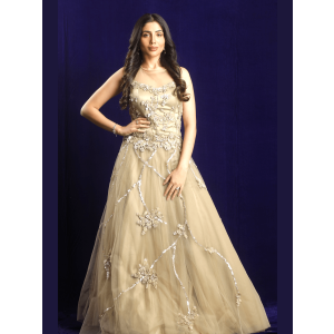 Light mouse colored ballgown with hand embroidered yoke in sequins and thread