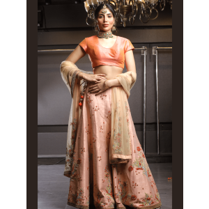 Peach silk lehenga with stylised hand embroidery in thread , beads and sequins