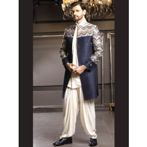 Navy blue silk and brocade indowestern sherwani with contrast detailing