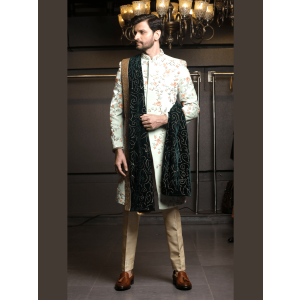 Light pista silk indowestern sherwani with all over thread and bead work in soft tones. Worn here with a green velvet embroidered stole