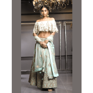Light mint silk lehenga with heavy silver zarf and curtana work. worn here with an off shoulder Cape blouse wth silver embroidery and light net dupatta