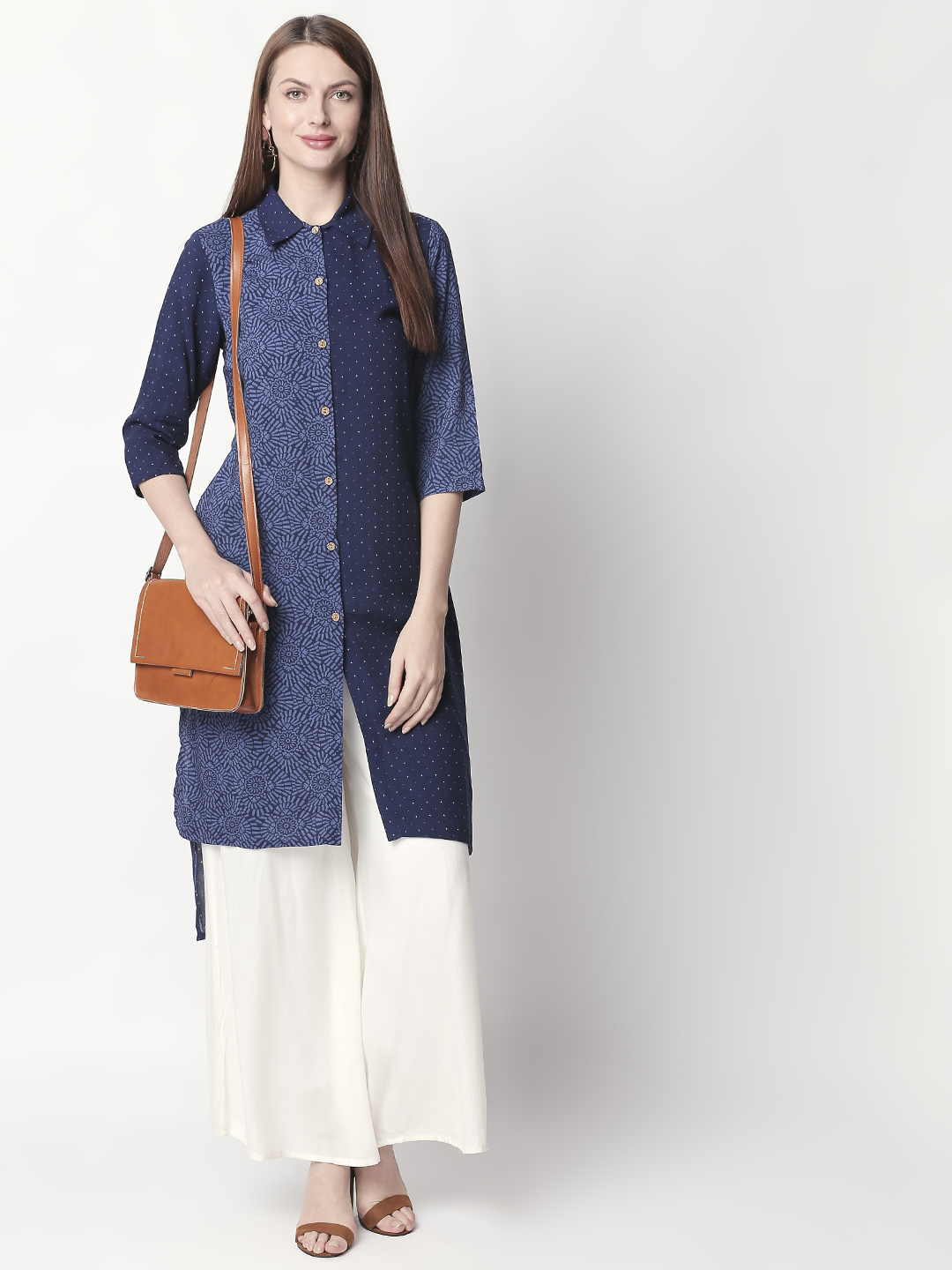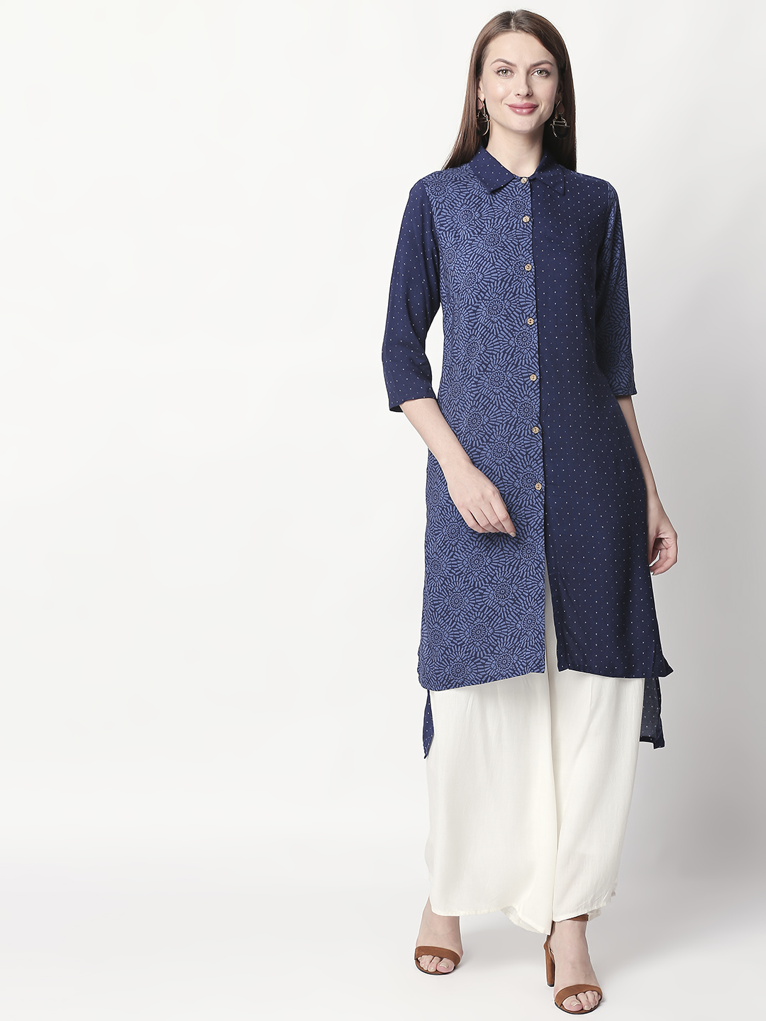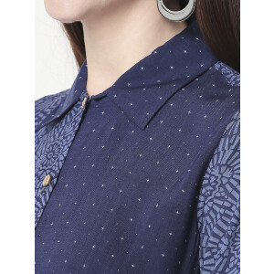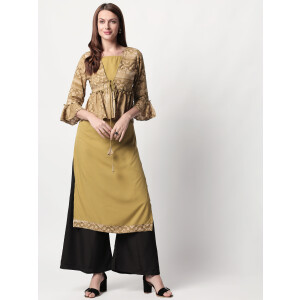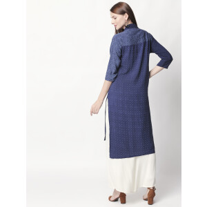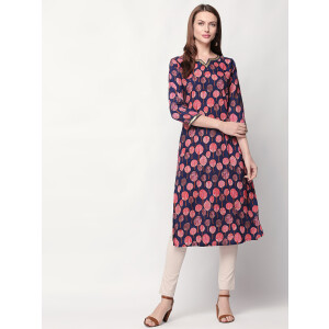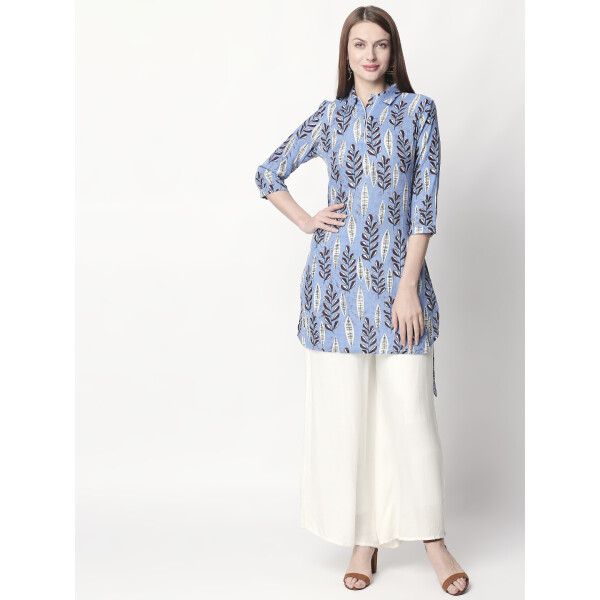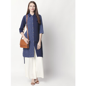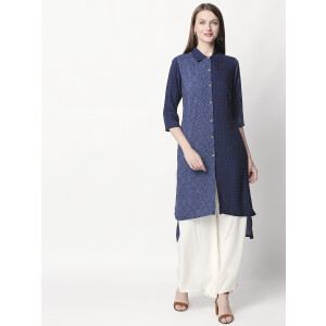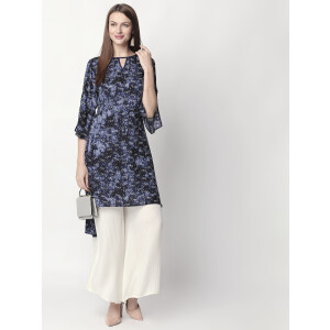 It has a V-neck collar and three-quartered sleeves to go with. Look super attractive with this everyday-wear by pairing it up with White palazzos and a stylish pair of shoes. The Kurti is fun, elegant and one-of-a-kind.