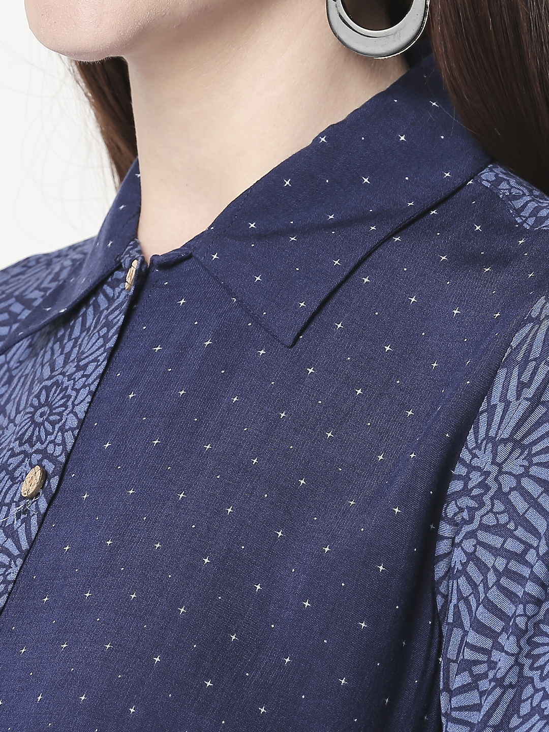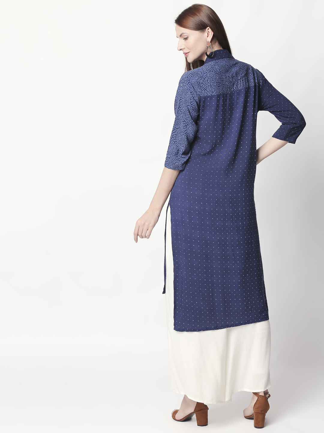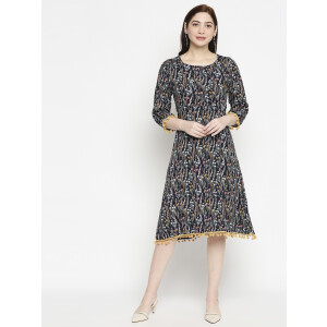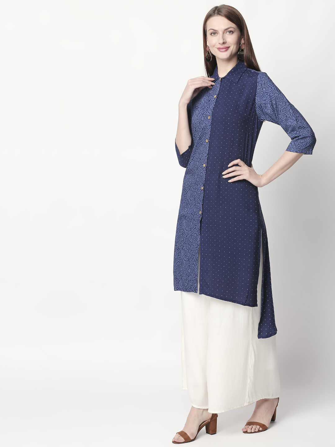 It has a V-neck collar and three-quartered sleeves to go with. Look super attractive with this everyday-wear by pairing it up with White palazzos and a stylish pair of shoes. The Kurti is fun, elegant and one-of-a-kind.
