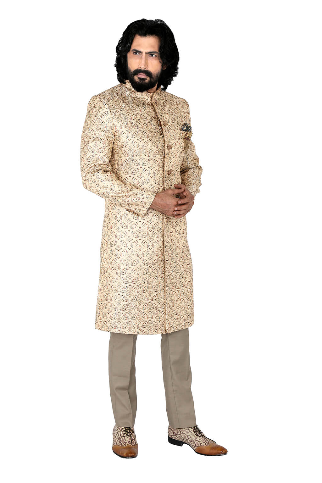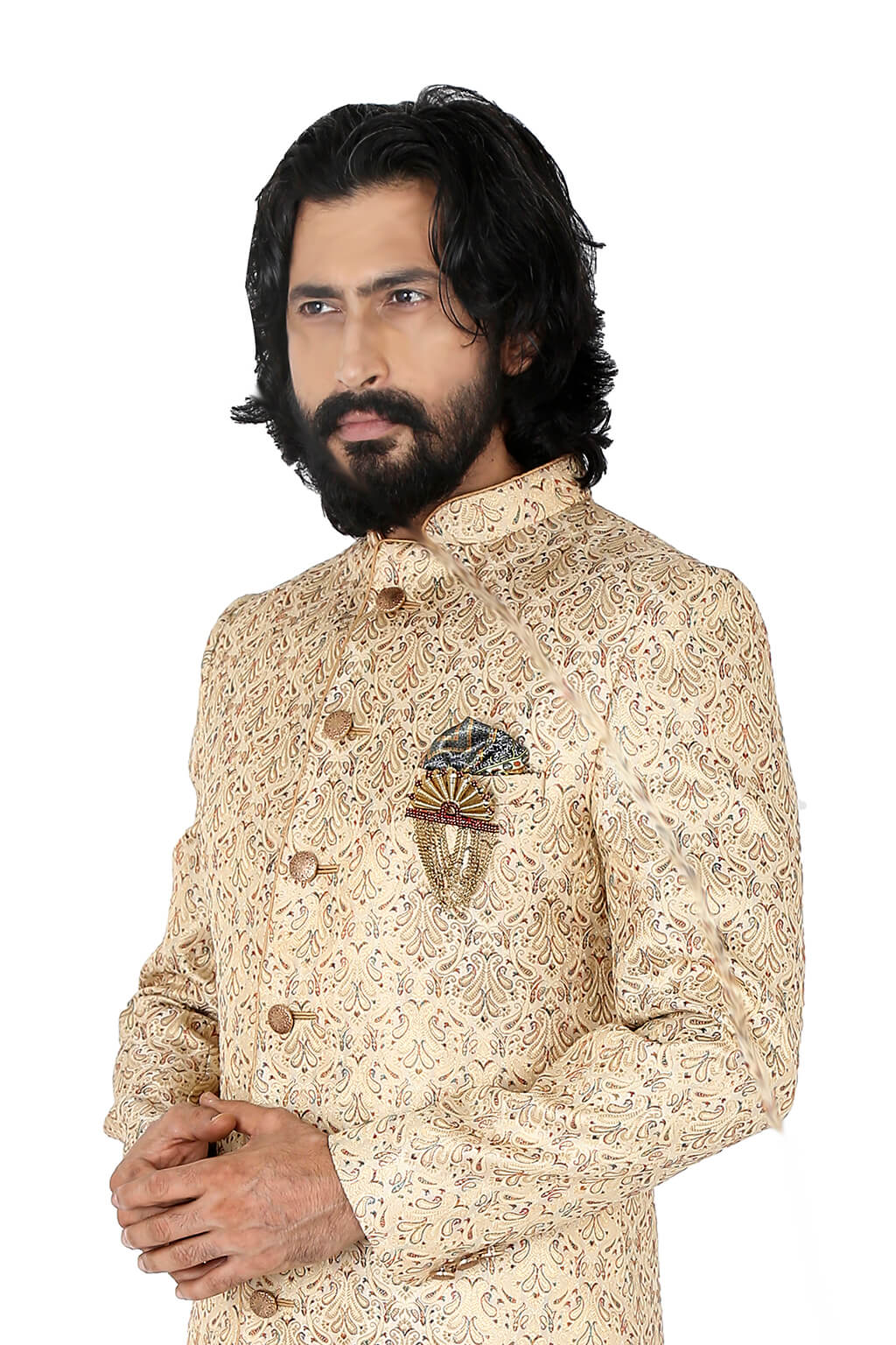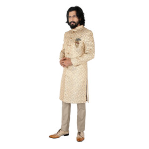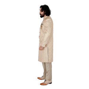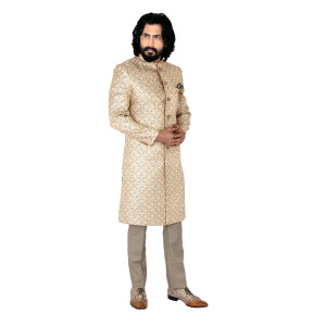 A simplistic yet rich sherwani in a pleasing off-white tone. This comes with front closure buttons and a classic mandarin collar. Create a remarkable look by pairing this sherwani with contrasting pants and our classy leather patterned shoes for a perfect effortless look this wedding season.
