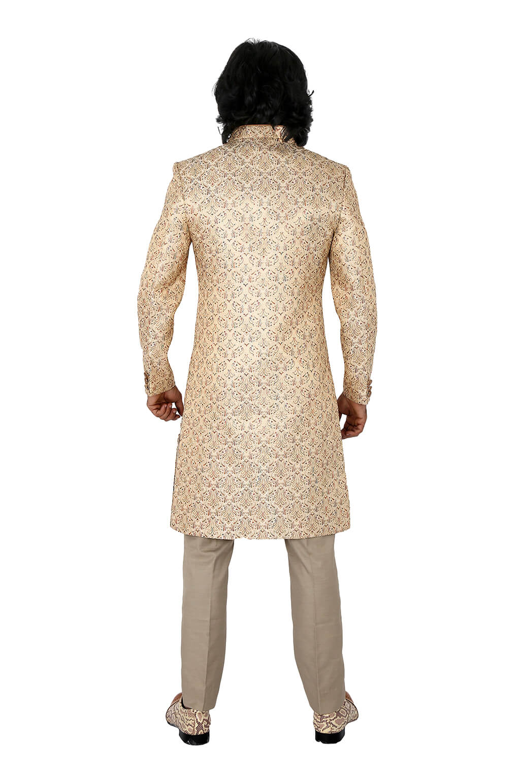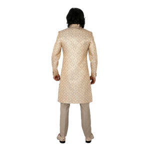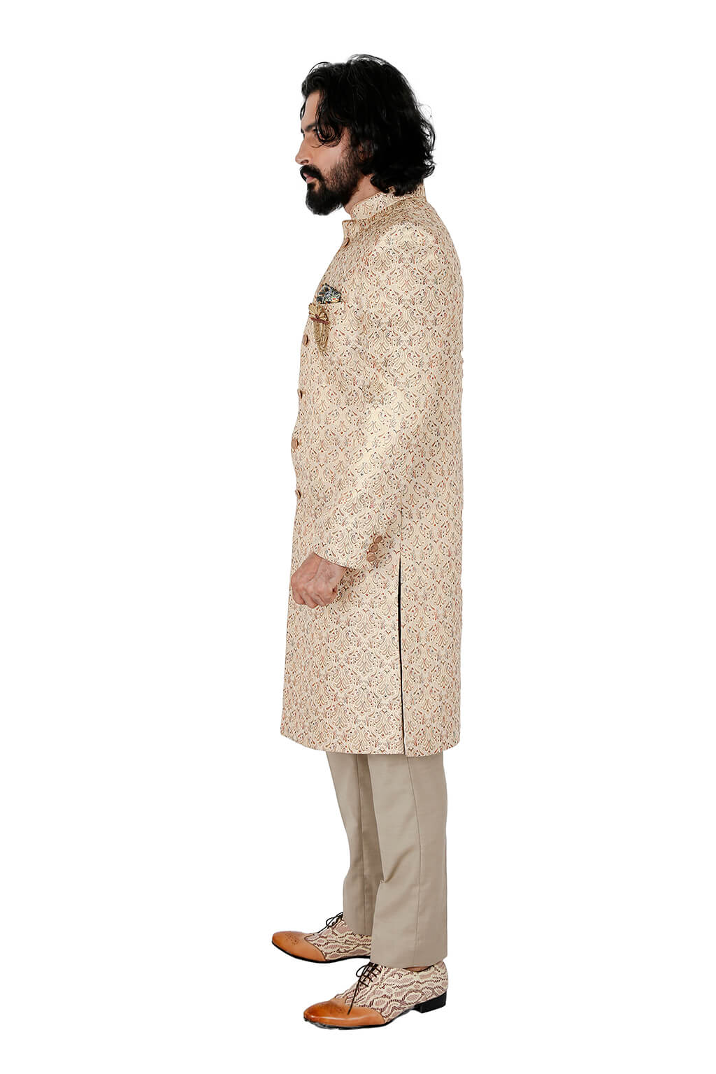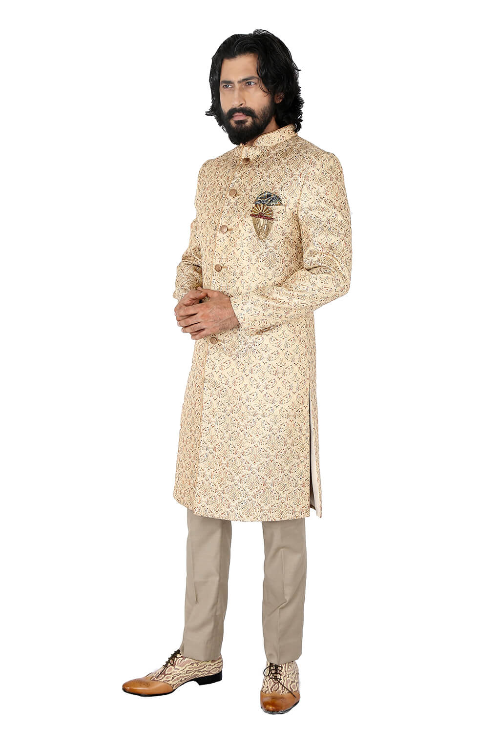 A simplistic yet rich sherwani in a pleasing off-white tone. This comes with front closure buttons and a classic mandarin collar. Create a remarkable look by pairing this sherwani with contrasting pants and our classy leather patterned shoes for a perfect effortless look this wedding season.