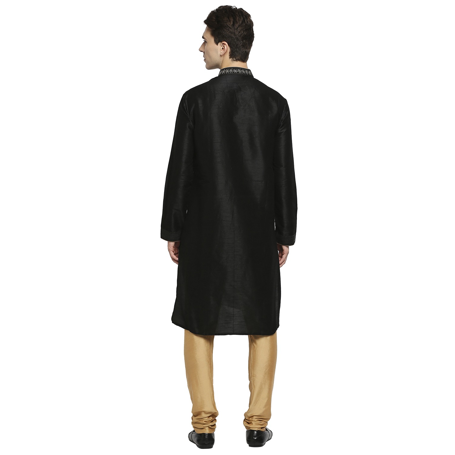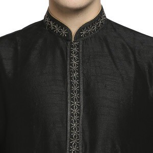 Be the first to review “Black Raw Silk Kurta With Silver Cord Dori Embroidery Detail At Collar And Placket”