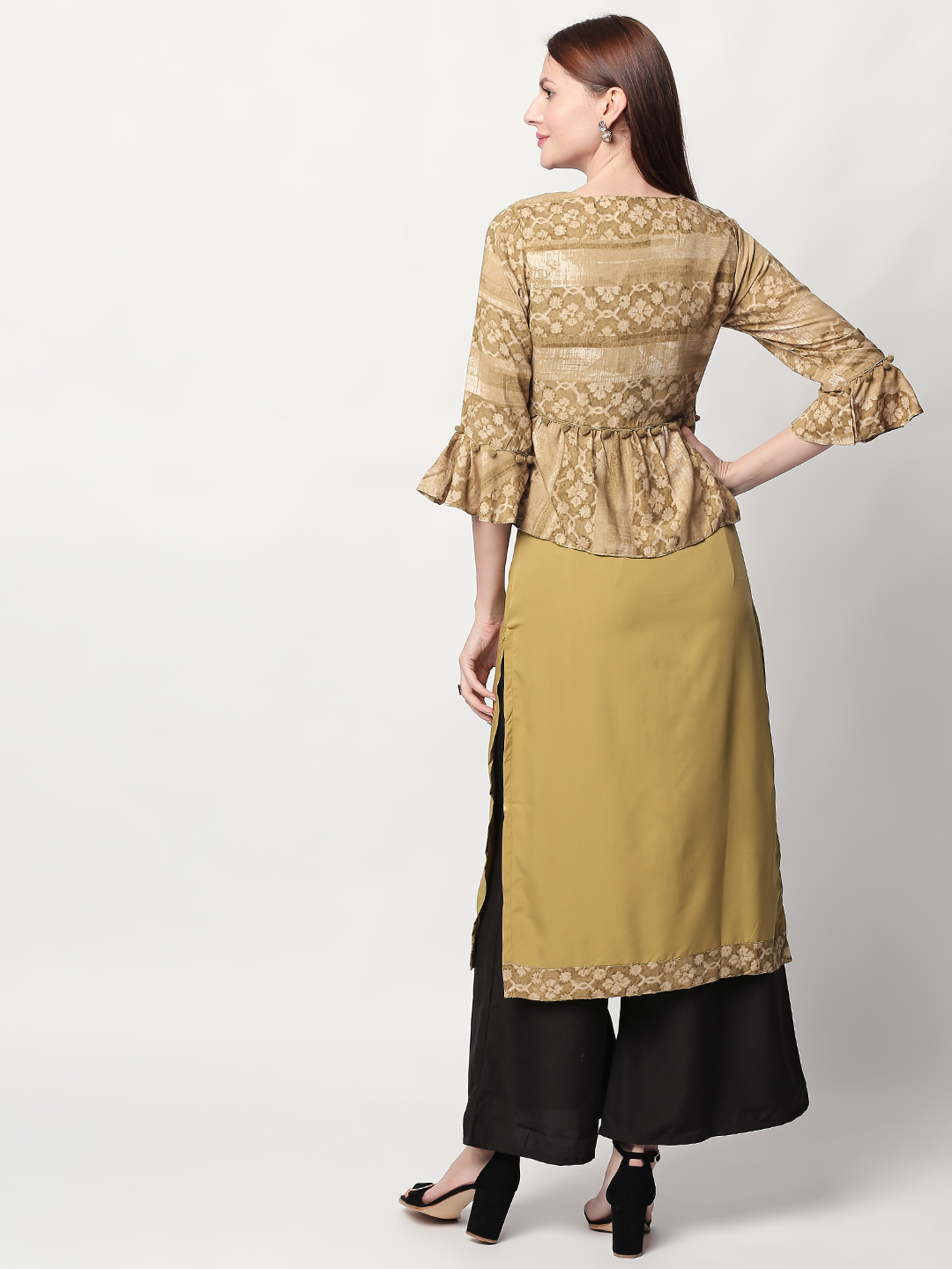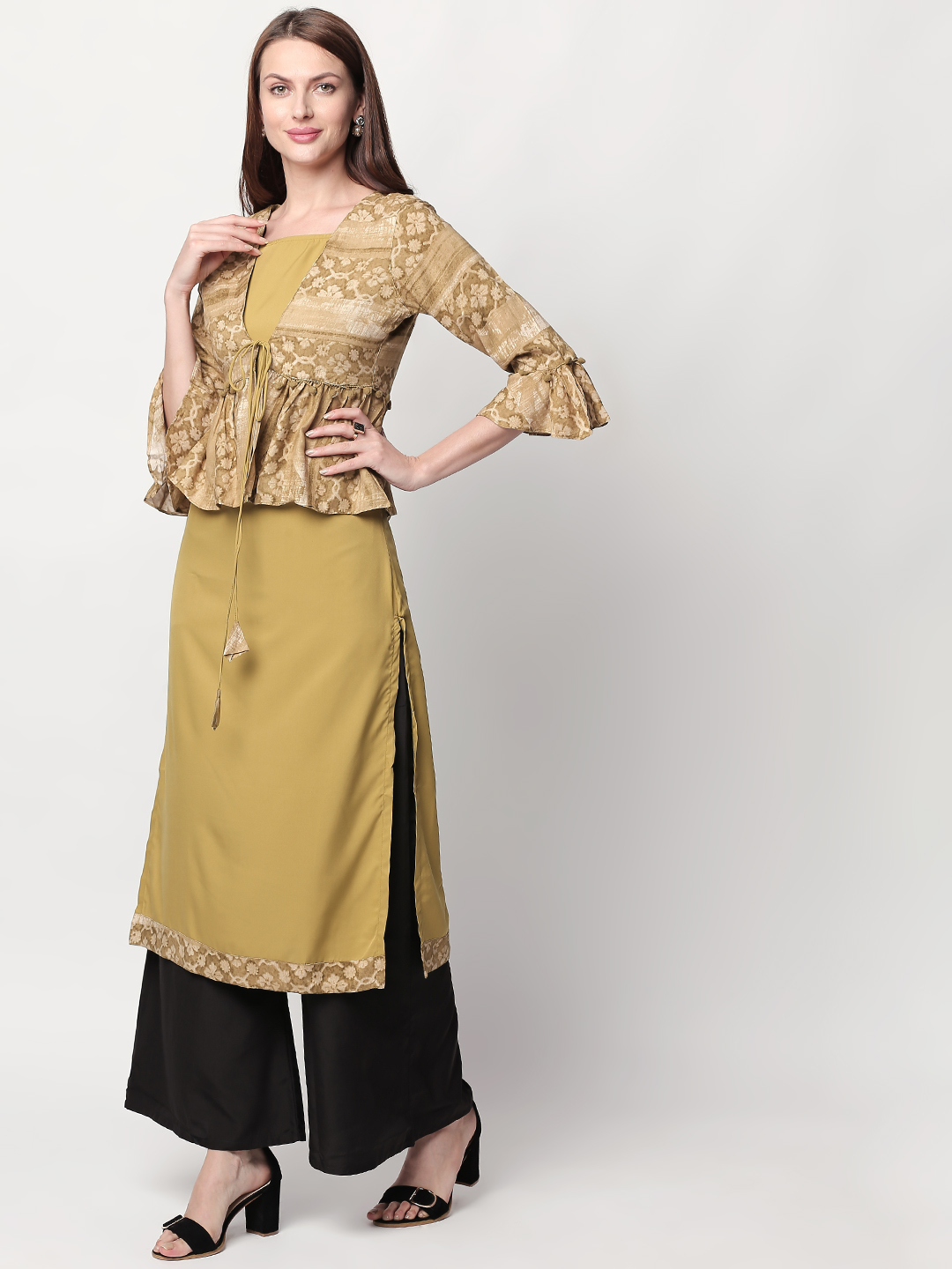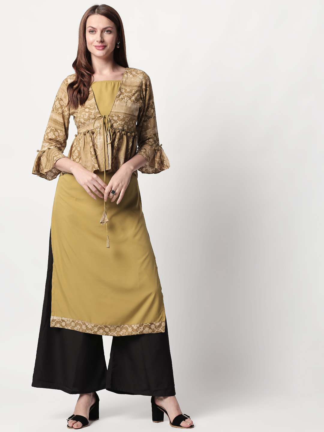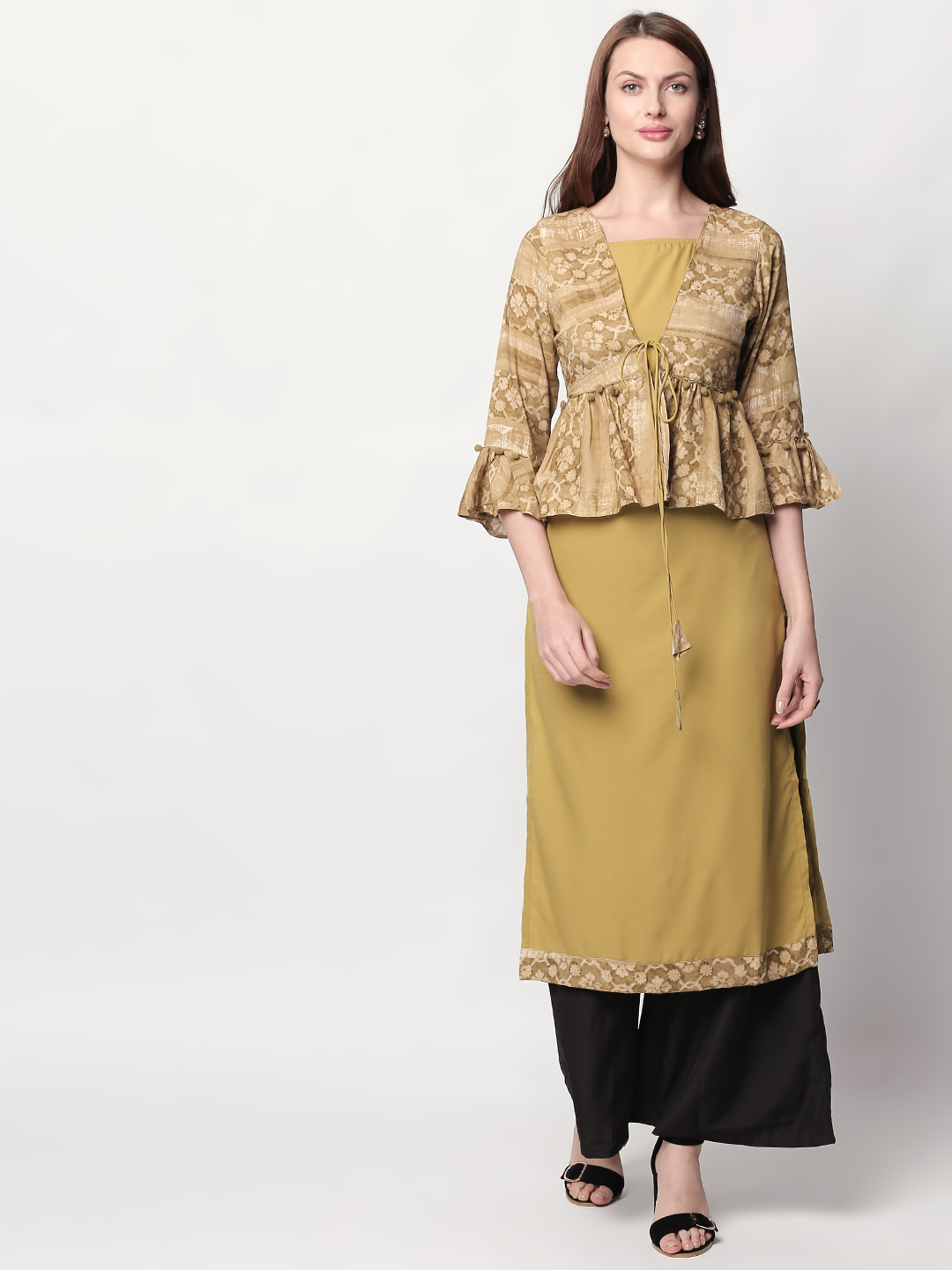 This Casual Olive Green Solid Rayon Kurti with Printed Jacket has a unique colour. The jacket can be tied with the laces, in a beautiful flower-like shape. It also has pretty ruffle sleeves with tiny pompoms attached. The Kurti in subtle green monotone sets the stage for the printed jacket to take over and bring in the element of wow.