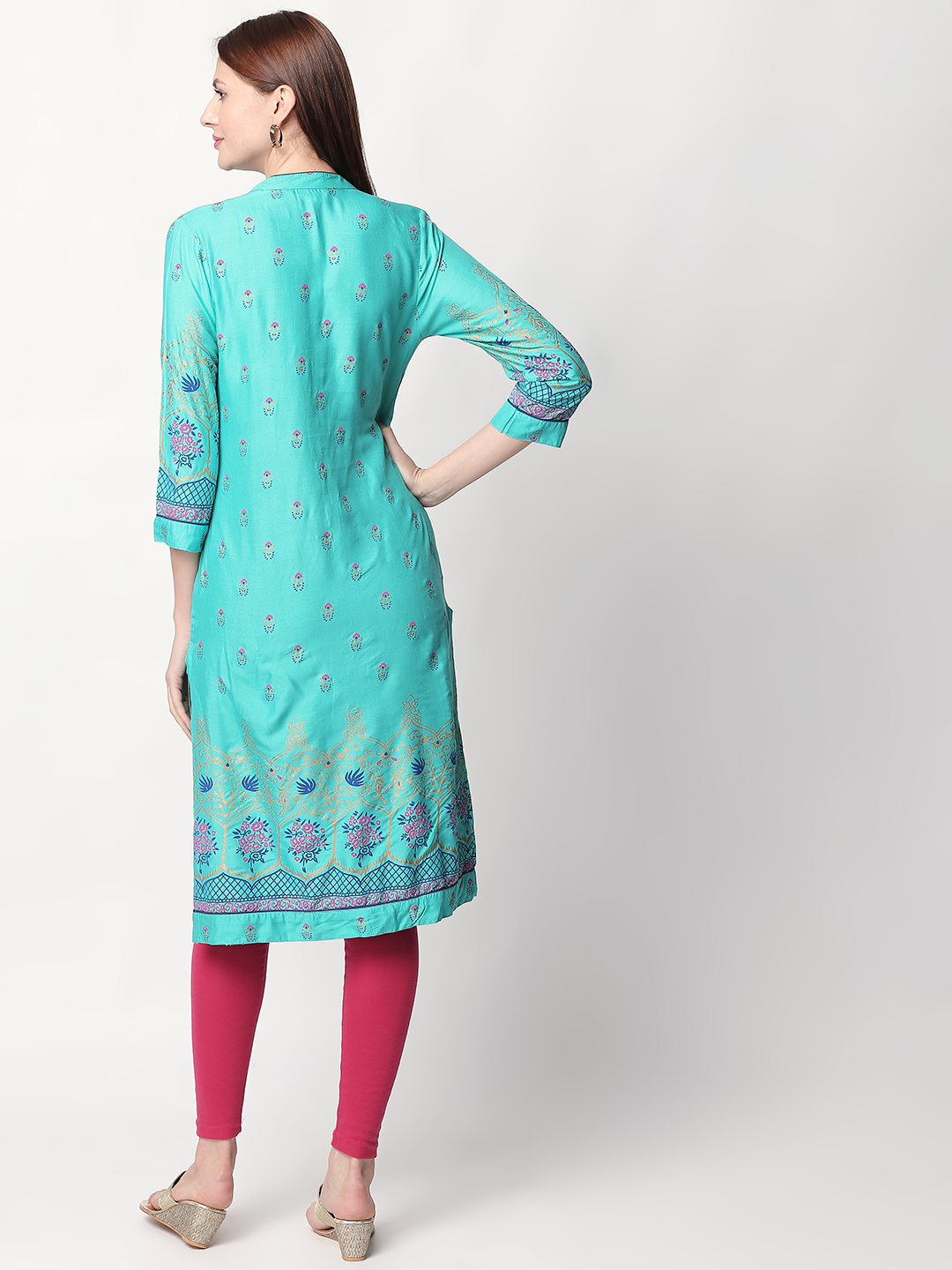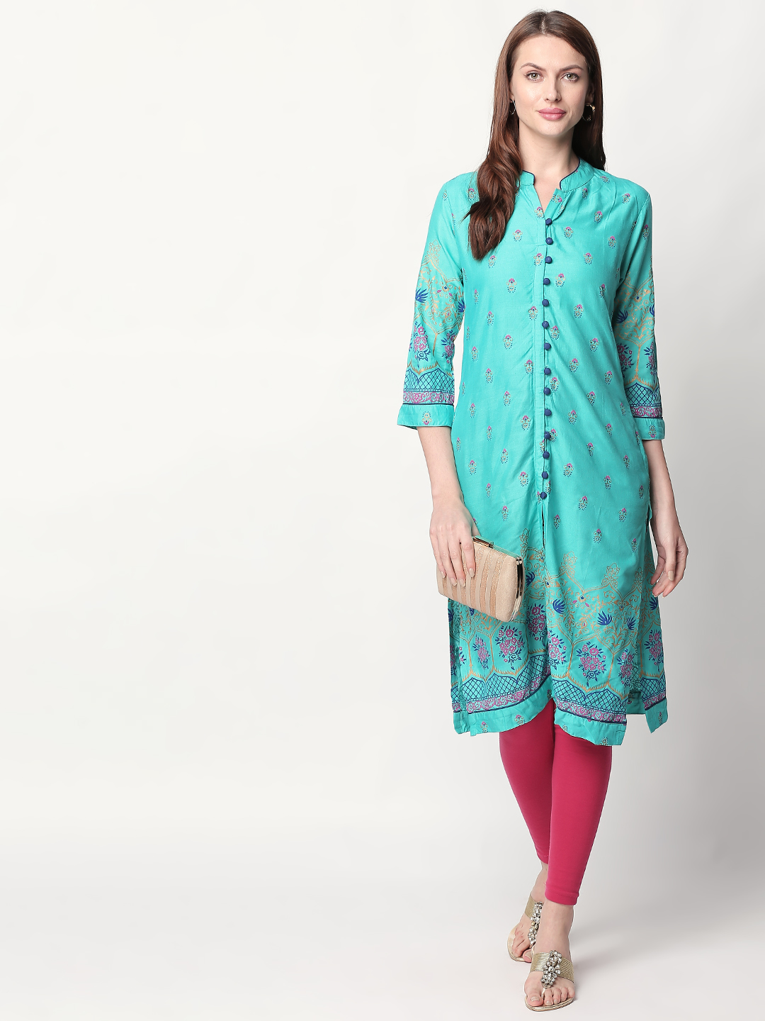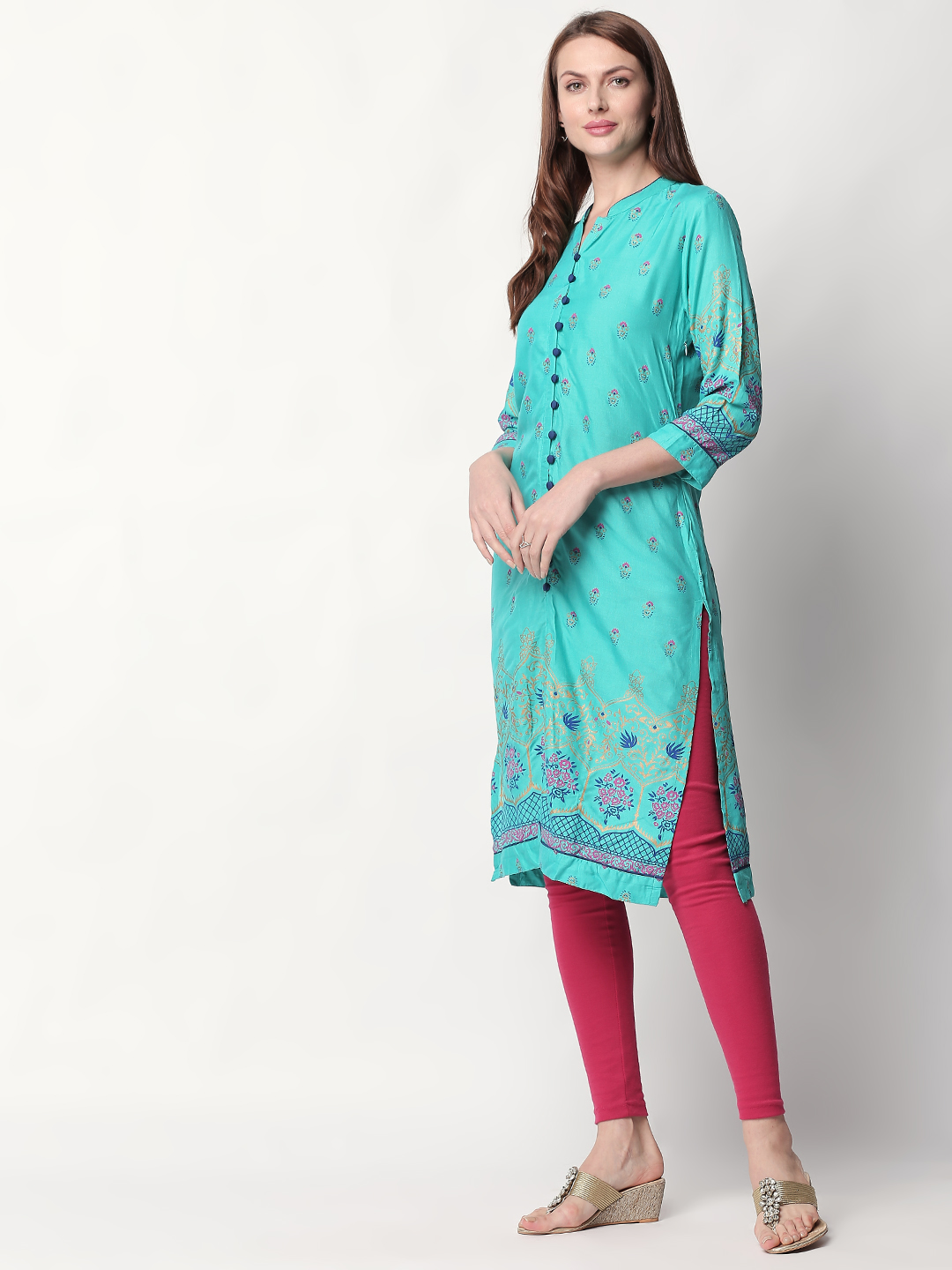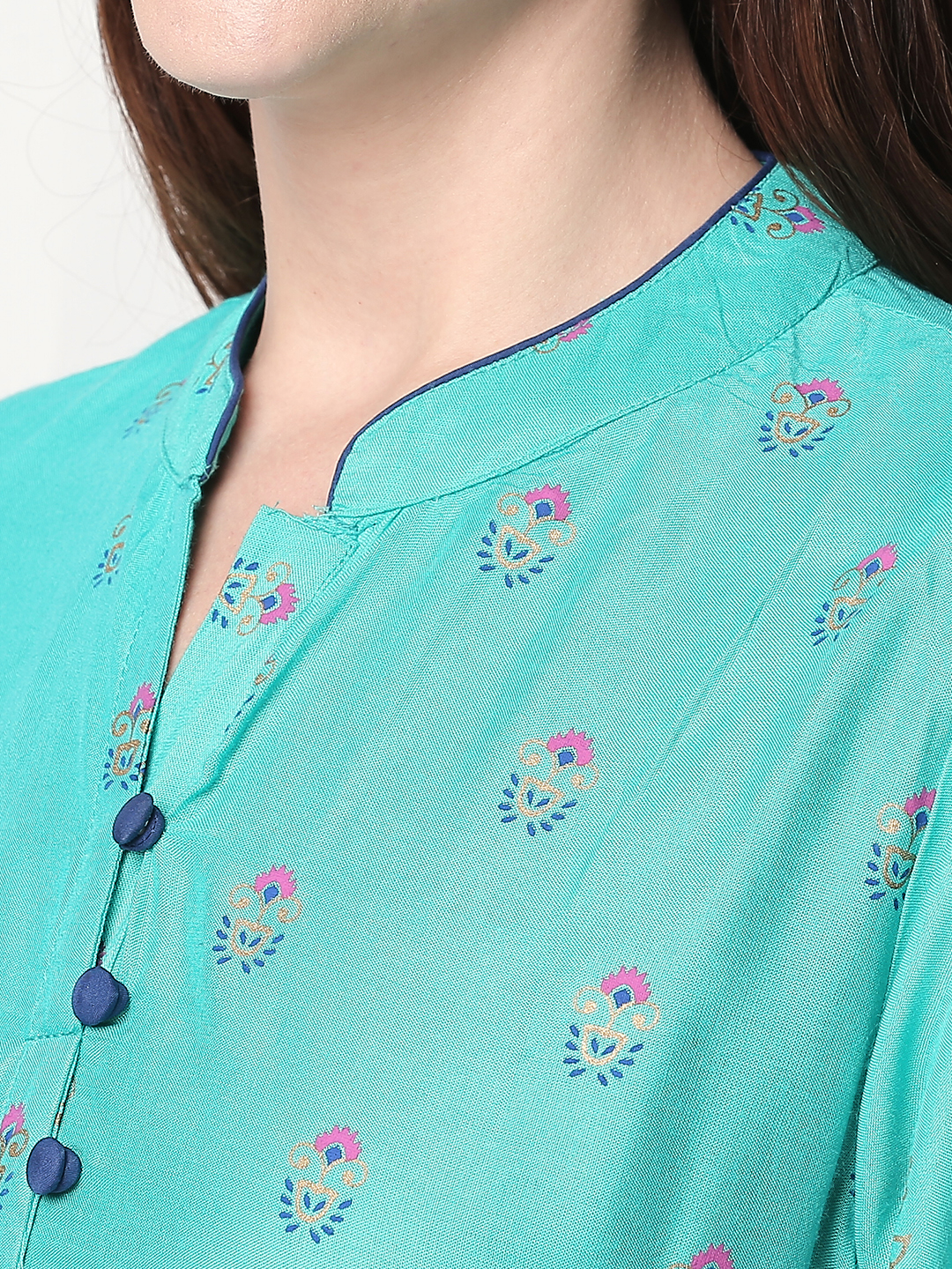 Light up your festive spirits with this Festive Turquoise Blue Printed Rayon Kurti. The straight-cut Kurti has a smart short collar rendering an urbane look. It has mini cotton-ball buttons in blue aligned in the middle. The bright and beautiful blue colour is accompanied with bountiful prints on the sleeves and tiny floral prints throughout the silhoutte in pink and golden. The Kurti has printed three-quartered sleeves and is slit briefly at the bottom. It is both fashionable yet traditional.