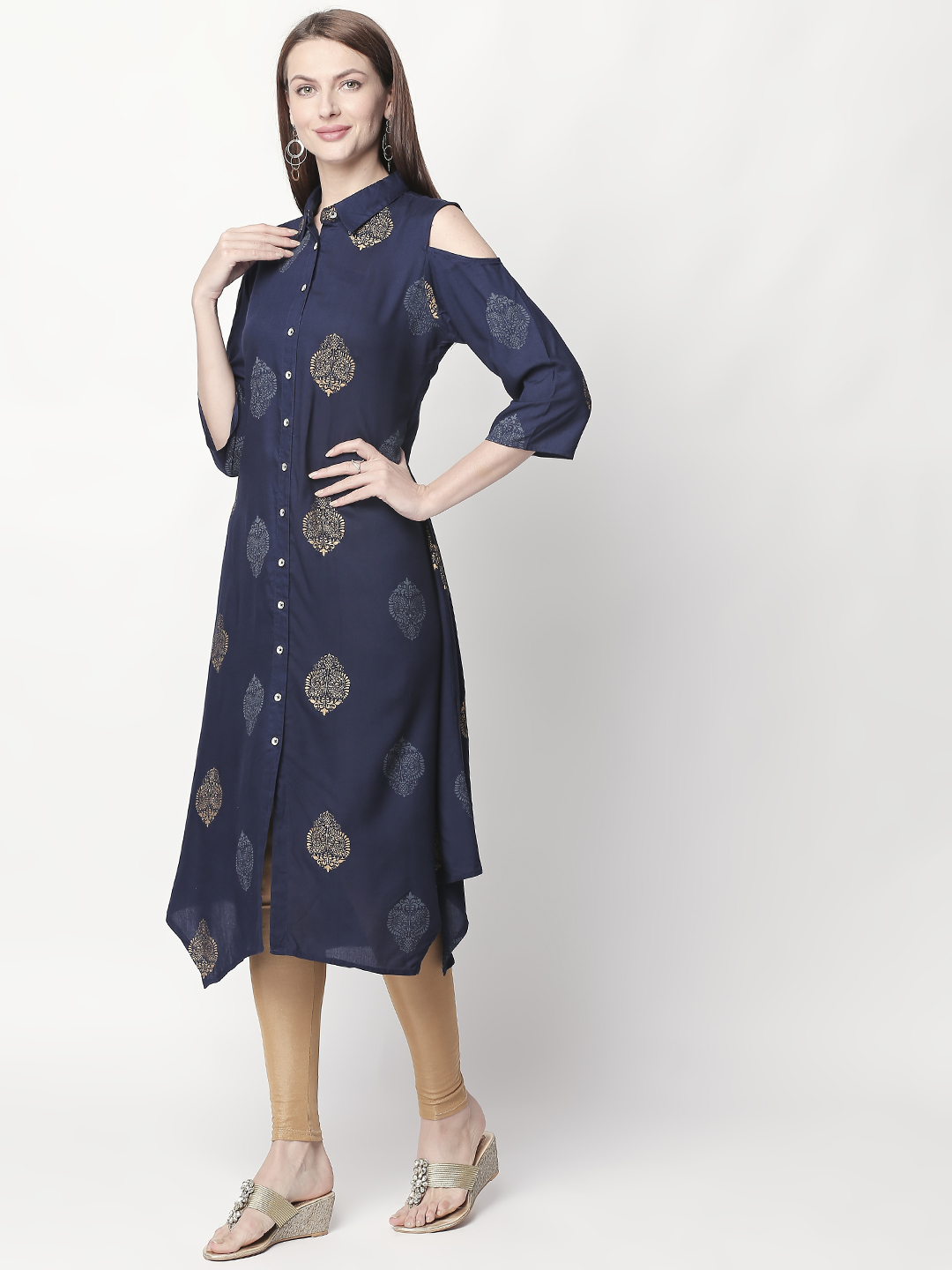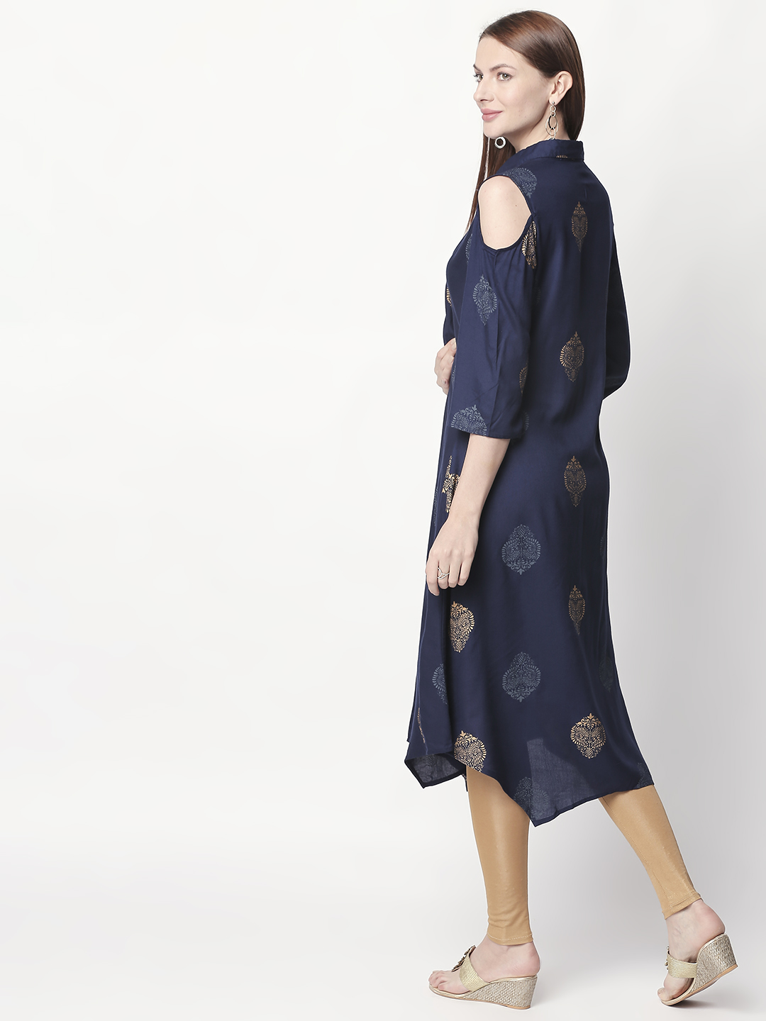 This is Casual Golden Floral Printed Navy Blue Kurti with sequin border at neck and sleeve with Navy Blue is unique in every way. Starting from the rare floral patterns to the long the Kurti is super stylish and classy. This piece is sure to become the next favorite in your wardrobe. The Golden Floral Print on the Navy Blue base gives the garment a suave appearance, which revamps your everyday look.